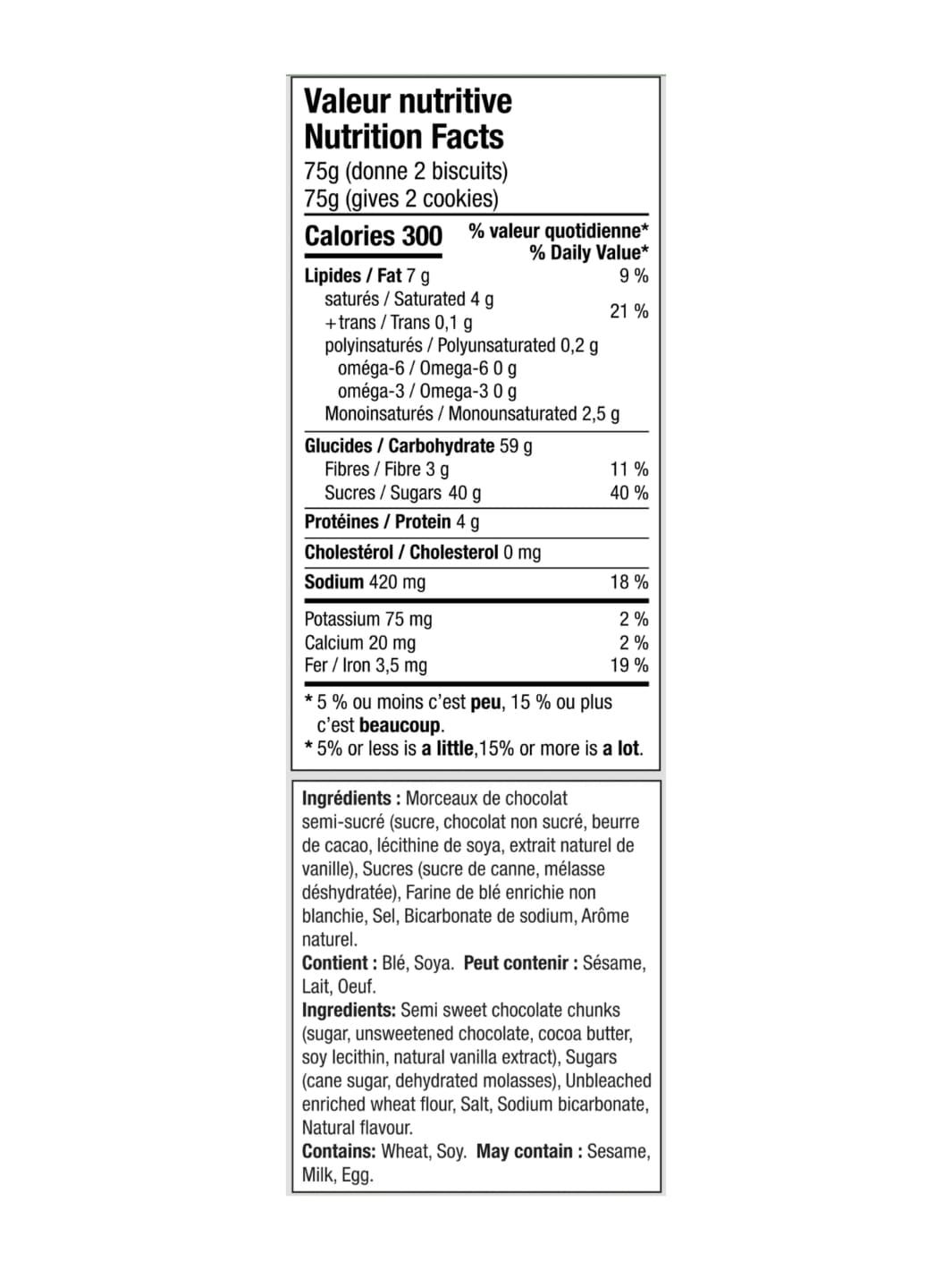 Ingredients: Semi sweet chocolate chunks (sugar, unsweetened chocolate, cocoa butter, soy lecithin, natural vanilla extract), Sugars (cane sugar, dehydrated molasses), Unbleached enriched wheat flour, Salt, Sodium bicarbonate,