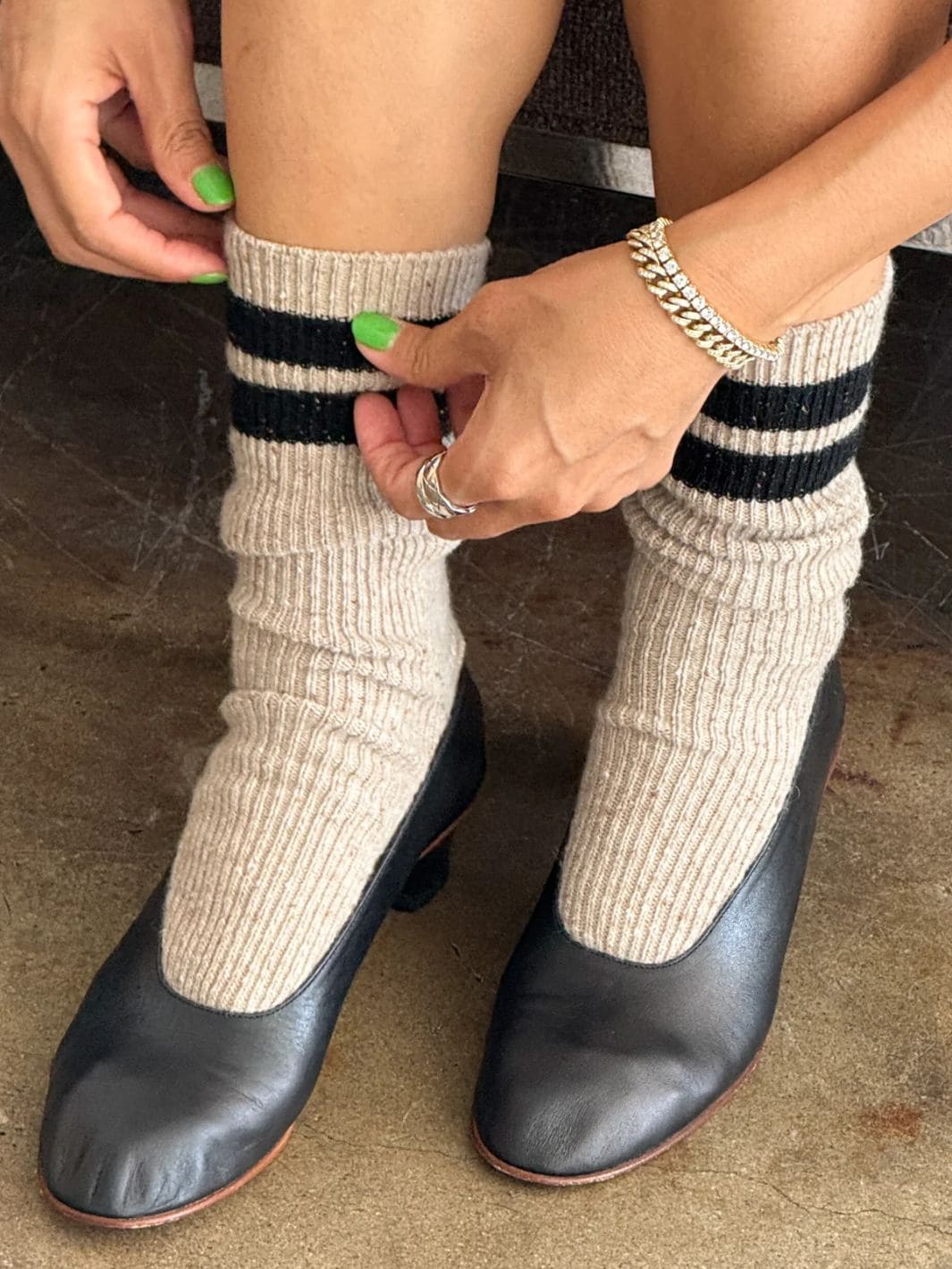 Made of a simple wool-blend, these socks are the perfect essential for cold weather. Snow Socks have a charming speckled look with calf length coverage. Double them for extra warmth while they carry your feet through the season with elegance. Pair them with anything from shearling booties to fisherman sandals in the fall.